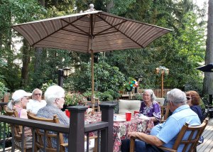 Sunday, July 9, 2017: Annual BBQ. Whether seated indoors or outside, about 20 OregonTuscans enjoyed themselves at a cookout at Audrey Perino & Ken Kane’s home. Burgers, Italian sausages, wine and an array of potluck salads, side dishes and desserts kept everyone full and happy!